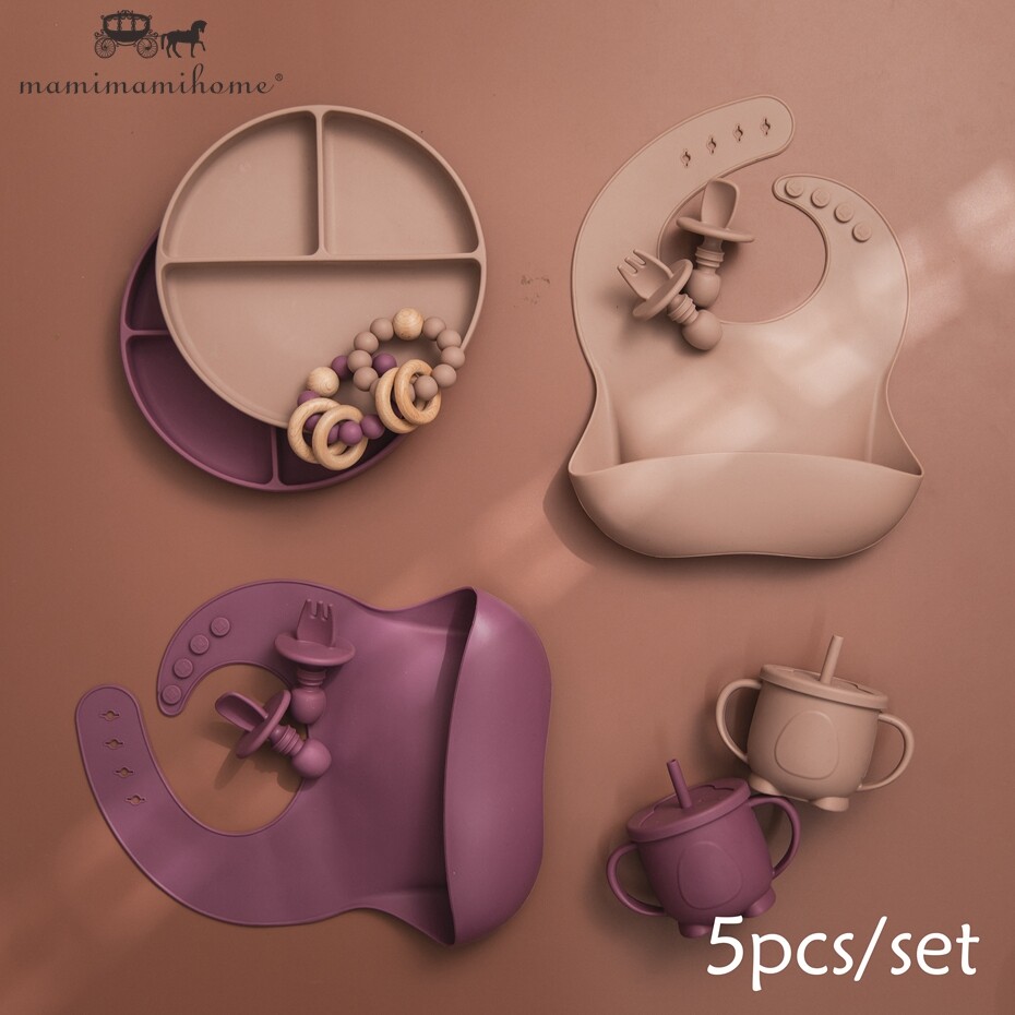 Mamimami Home Baby Feeding Meal Set 5pcs 100% Silicone Anti-fall Suction Plate,Spoon & Fork,Sippy Cup,Soft Bib
