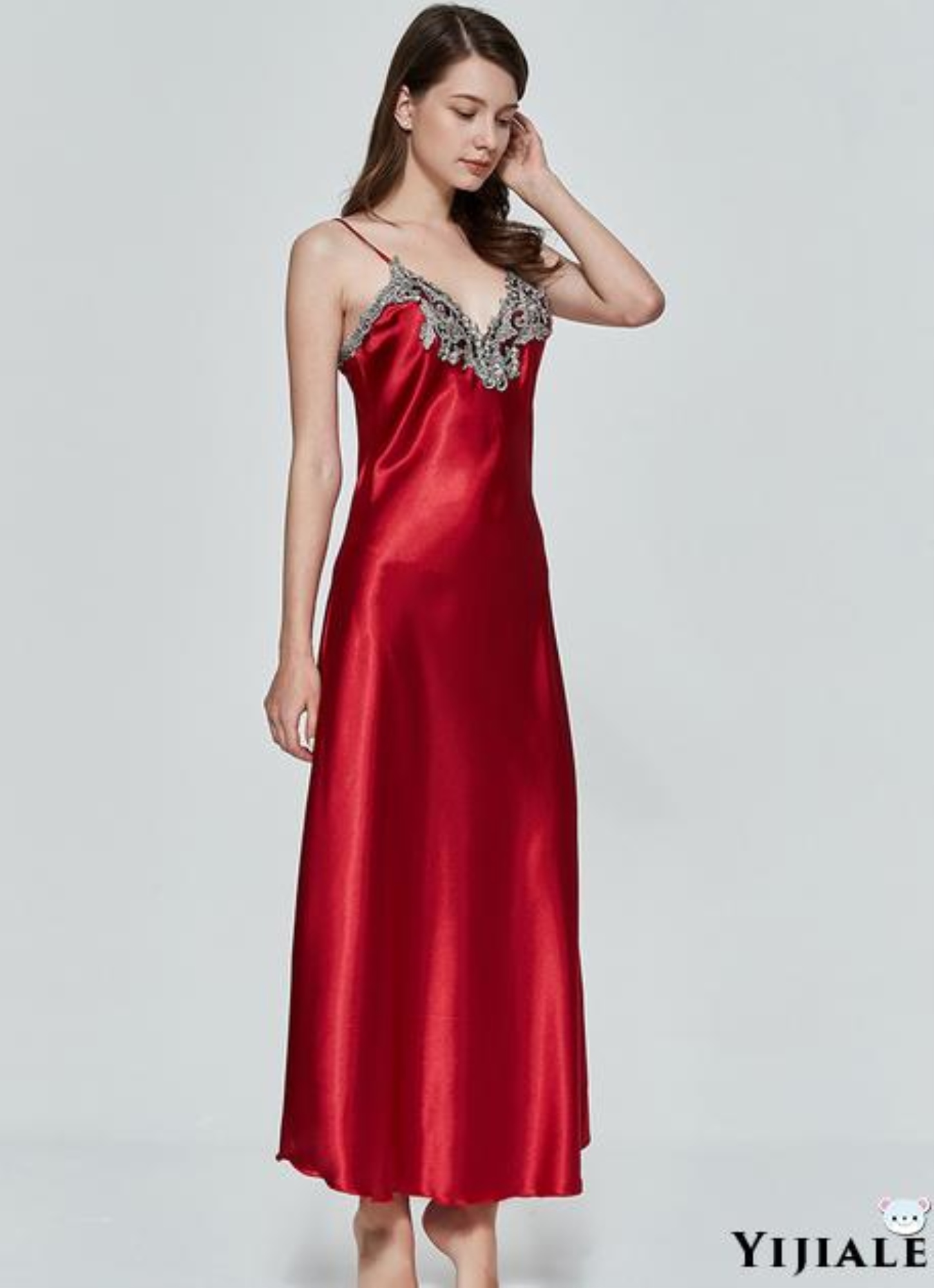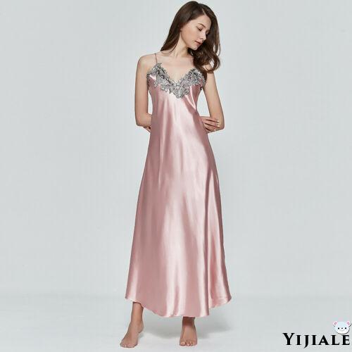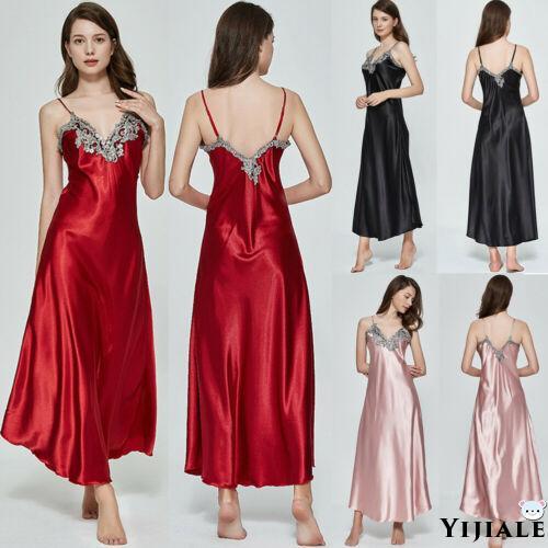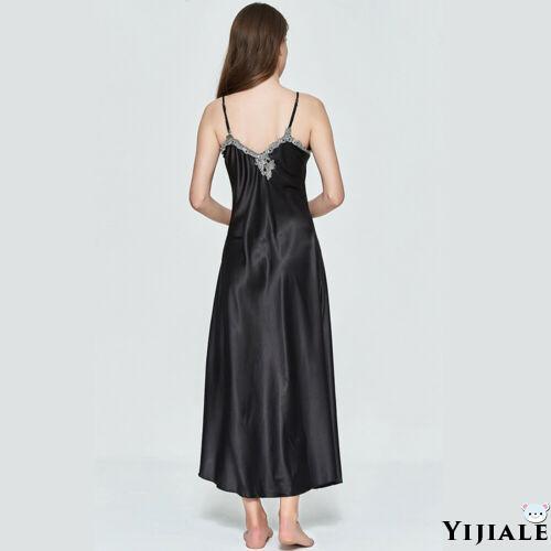 ◄∋ YJ★Women Satin Long Nightgowns Silk Lace Sexy Lingerie Sleeveless Deep V Nightdress Sleepwear